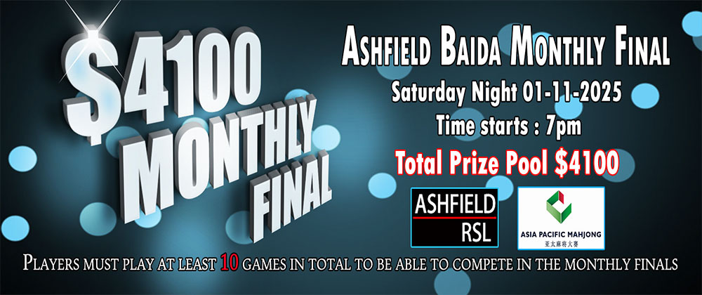 Please also note that the afternoon and night games on 2 September will be held at Ashfield RSL – 4 Baida Mahjong – Total Prize Pool: $1000