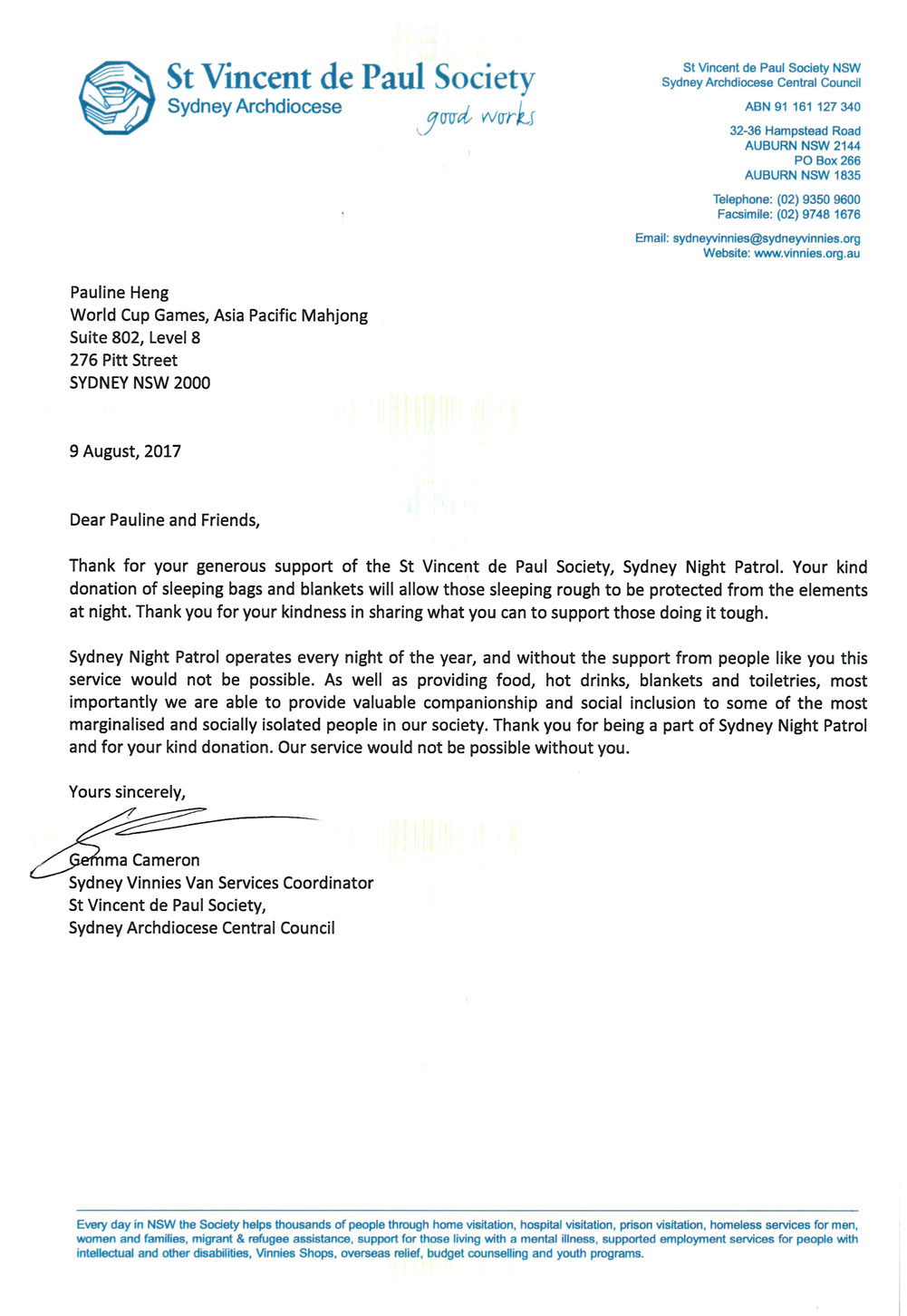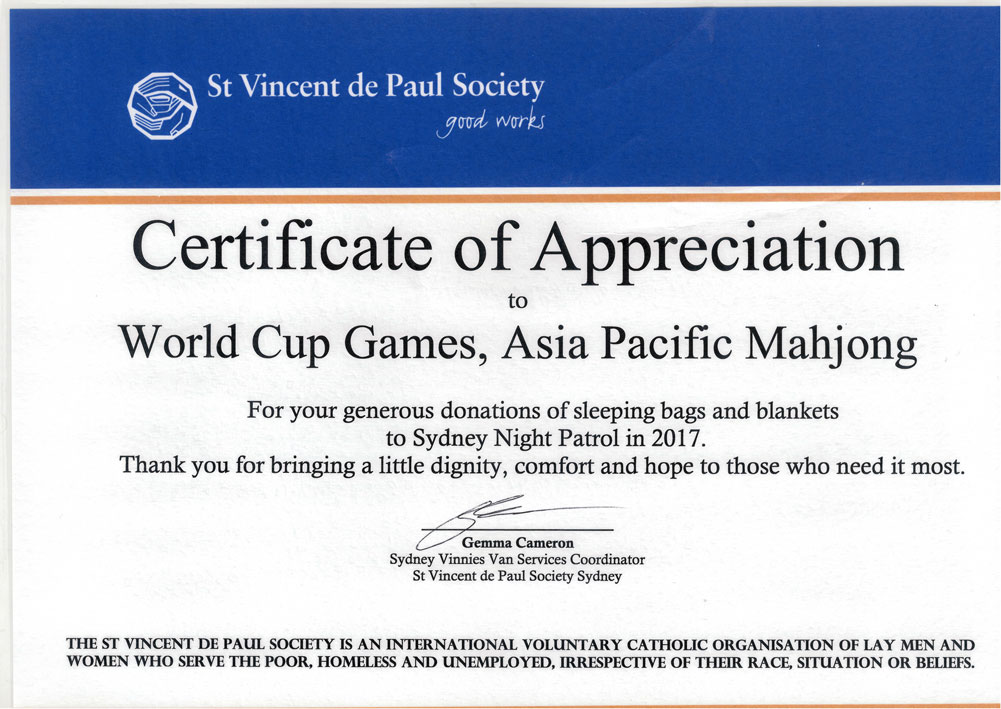 Certificate of Appreciation and thank you letter from St Vincent de Paul Society