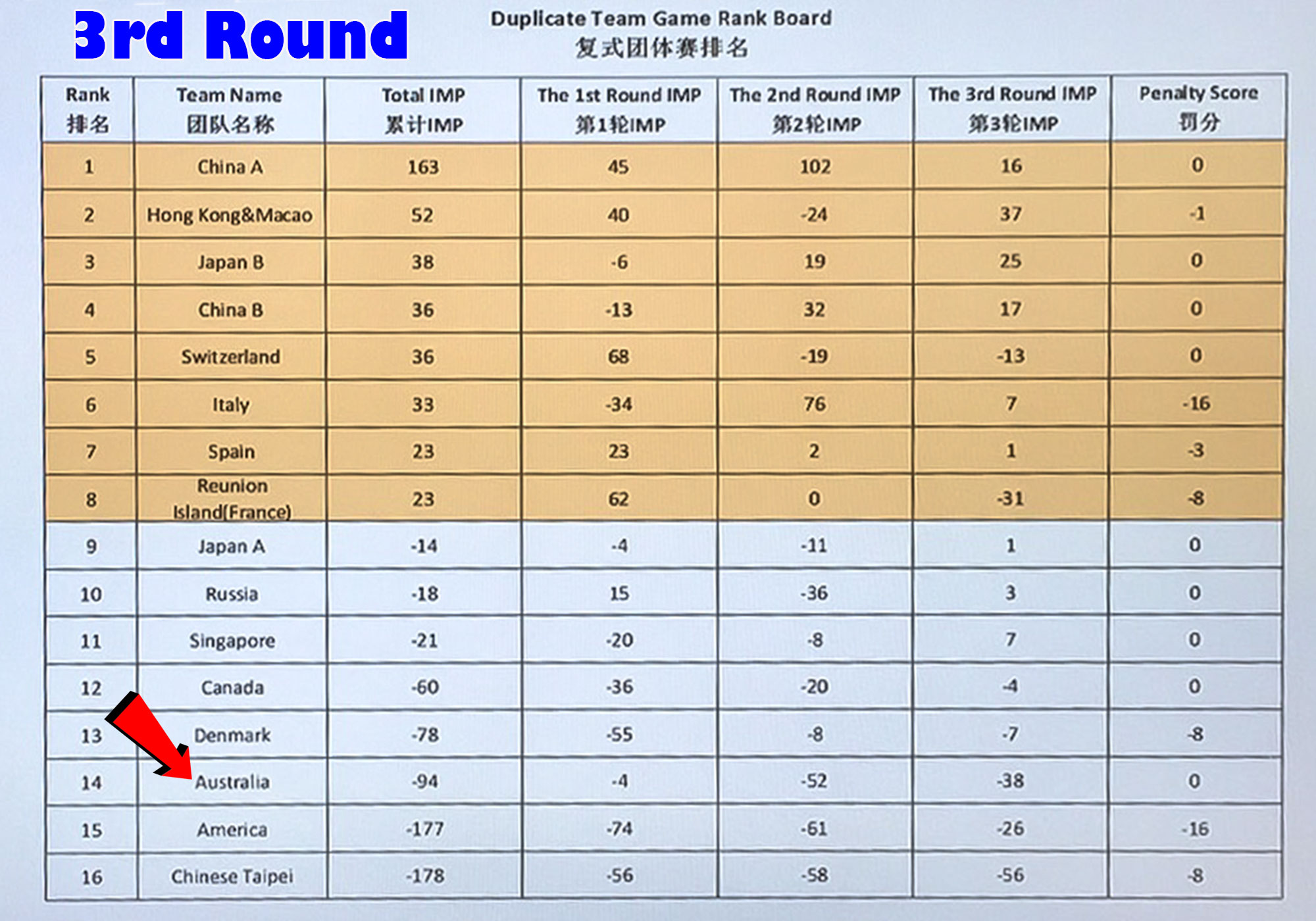 Team Australia did not do too badly for its first attempt at the Team Duplicate Mahjong tournament held in Sanya. This is the first time Duplicate Mahjong is being played at a tournament as a test to it becoming a reality at the next World Mind Sports Games to be hosted in 2016 in Rio de Janeiro, Brazil.